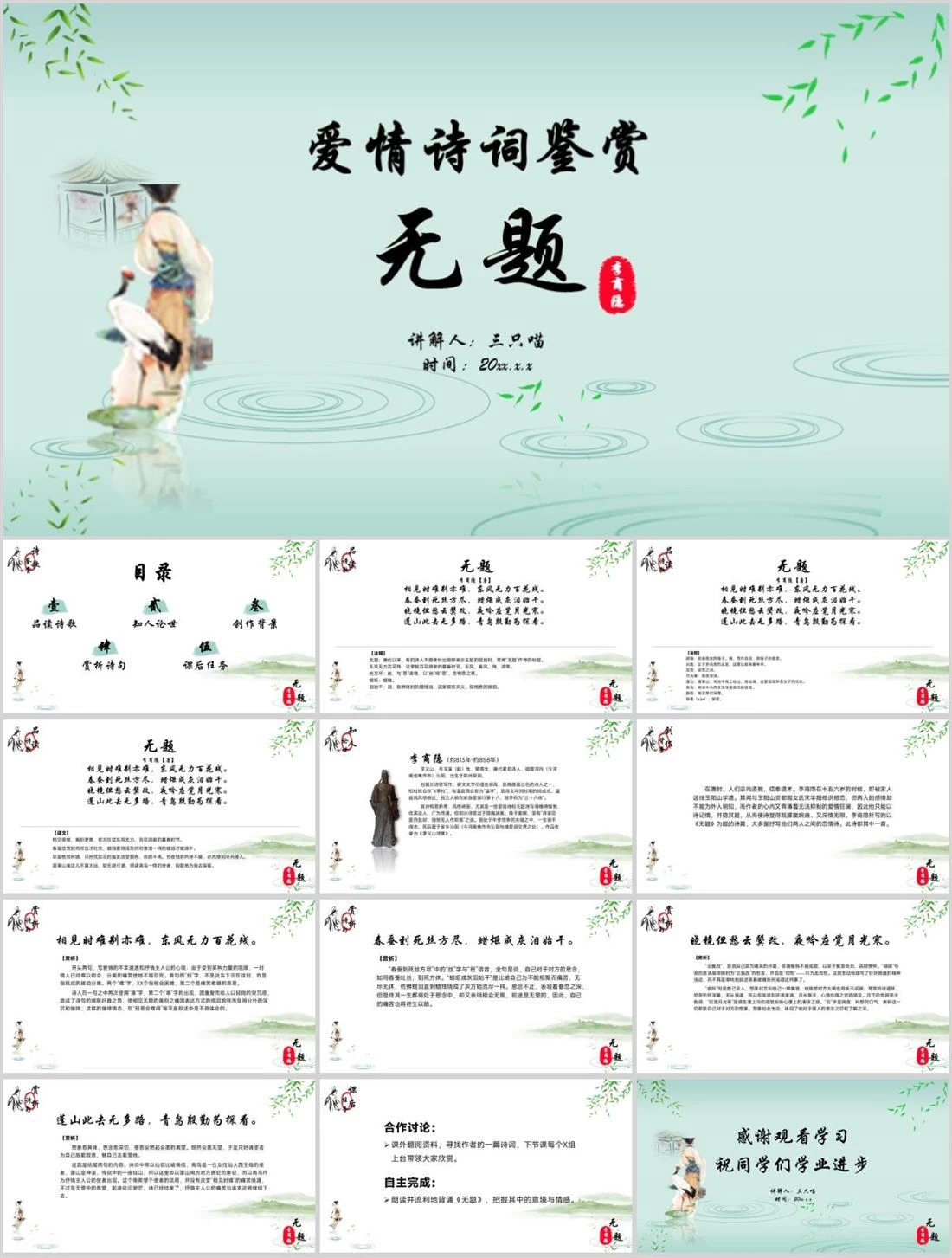 爱情诗词鉴赏无题讲解人:三只喵时间:20xx.x.x李商隐170套著名诗人合集,模版,唐代诗人李商隐14,9,