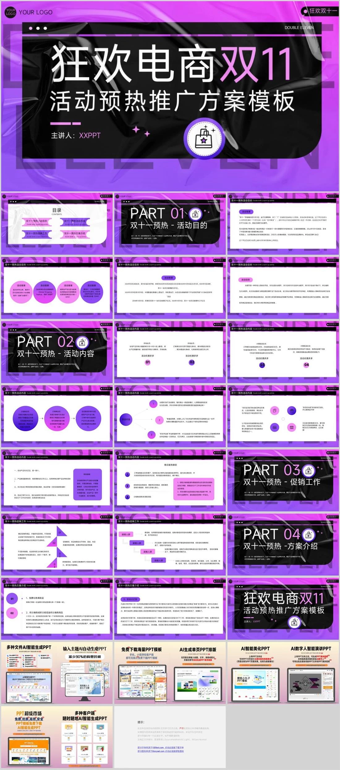 DOUBLE ELEVENDOUBLE ELEVEN狂欢电商双11活动预热推广方案模板YOUR LOGOYOUR LOGO主讲人:XXPPT狂欢双十一电商推广方案,